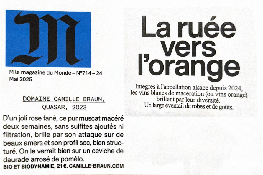 Avant de clore l’année, un dernier clin d’œil à l’une de nos cuvées les plus singulières : Quasar 2023, notre muscat de macération, mis en lumière par Laure Gasparotto, dans le hors-série La ruée vers l’orange de M Le magazine du Monde de mai dernier, consacré aux vins de macération de l’AOC Alsace.