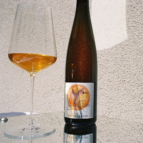 Le gewurztraminer change de registre : il quitte le seul registre aromatique pour entrer dans la matière. La macération lui donne une autre voix. Le nez mêle rose séchée, écorce d’orange, épices douces, graines de cumin, thé noir et une légère touche de résine, le tout posé sur un fond de peau de fruits. En bouche, la structure surprend : les tanins de peau apportent du relief, une forme de grain, tout en gardant une belle fluidité. La matière est ample mais digeste, la finale est sèche, épicée, presque infusée, avec une légère amertume noble qui allonge le vin. Un gewurztraminer de caractère, plus terrien que démonstratif, fait pour ceux qui aiment les vins de macération gastronomiques, à table, sur les épices, les cuisines du monde et les accords audacieux.