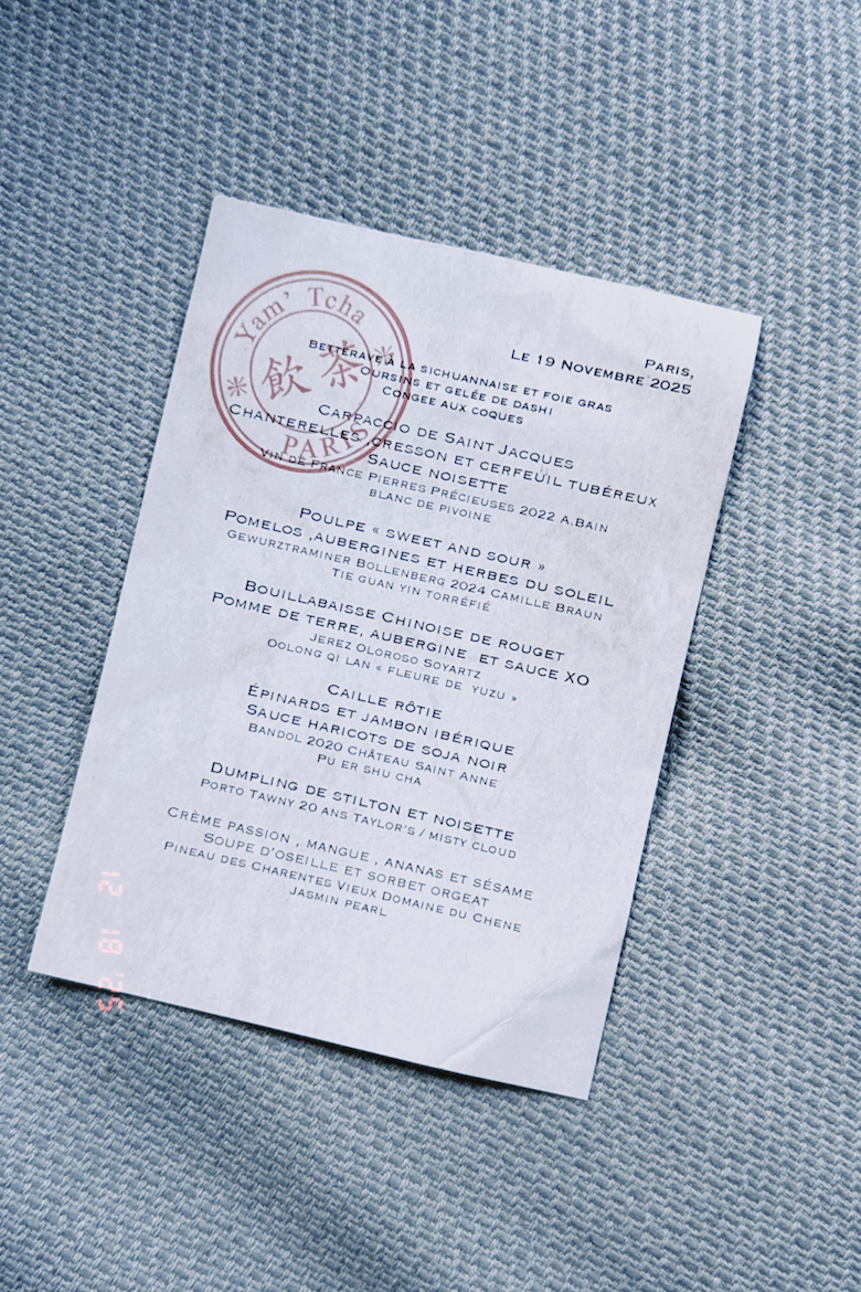Ce 19 novembre 2025 a pris des allures de moment suspendu. Pour fêter les 29 ans d’Annabelle, tous trois ont quitté Orschwihr – Annabelle, Hippolyte & Quentin – pour aller goûter la cuisine d’Adeline Grattard, au Yam’Tcha* (une étoile au Guide Michelin), à Paris. Une fois la porte franchie, le temps a semblé se plier : le restaurant les a transportés dans un univers asiatique tout en nuances, guidés par les conseils d’un sommelier du thé et par le regard de Marine Delaporte. Cette dernière avait choisi de mettre à l’honneur le Gewurztraminer Bollenberg 2024 du domaine, servi en accord avec le poulpe sweet and sour.