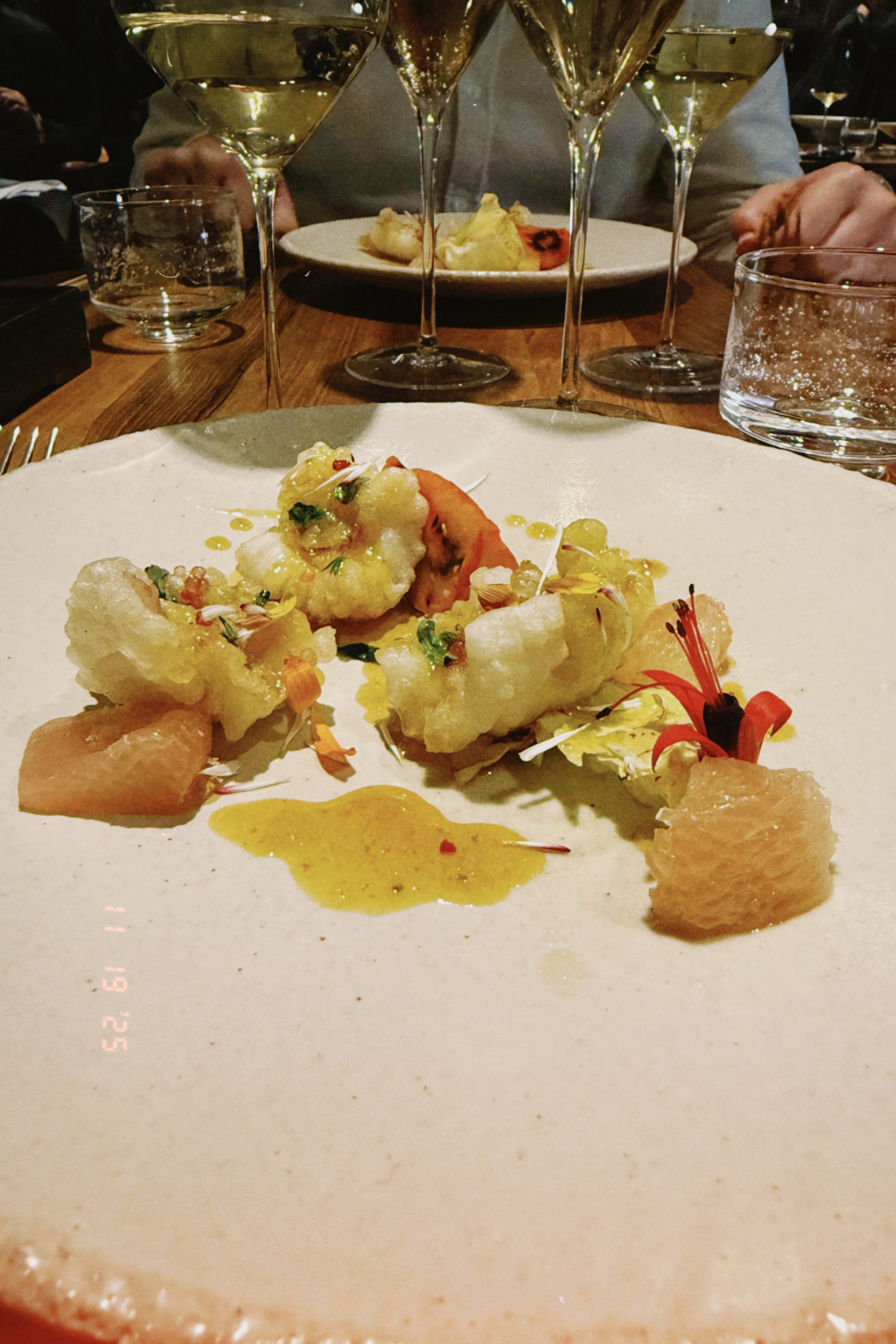 Le vin, ce soir-là, tenait son rang : une robe jaune doré brillante, un nez de rose, de fruit de la passion et d’écorce d’orange, traversé d’épices douces, où la générosité restait contenue par la discipline du calcaire. En bouche, la richesse était encadrée par la fraîcheur de pente, avec un sucre fondu dans une texture nette, signée par une fine amertume de zeste et une salinité discrète. Une sensualité tenue par la pierre, qui trouvait dans la cuisine de la cheffe un écho d’une précision rare.